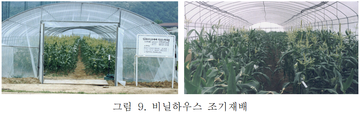 비닐하우스 조기 재배 시에는 하우스 내 수분 증발로 수분이 부족하기 쉬우므로 1주일에 적어도 20∼30mm의 물을 인위적으로 공급해야 하는데 그렇지 않으면 한발과 고온이 겹쳐 상품성 있는 옥수수 생산에 차질을 가져오고 수량 감소를 초래할 수 있습니다.