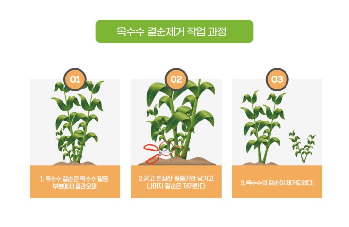 옥수수 재배 시 질소비료를 모두 밑거름으로 주면 토양에서 유실되기 쉬우므로 밑거름과 웃거름으로 나눠주는 것이 좋다고 하는데요, 웃거름은 옥수수 잎이 7∼8장 나오고 키가 어른 무릎 높이 정도 자랐을 때 주면 됩니다. 또한 옥수수는 뿌리 끝에서 거름을 흡수하기 때문에 포기 바로 밑에 주는 것보다 포기와 포기 사이에 주는 것이 좋고 식물체가 젖어있을 때 비료를 주면 염류장해가 발생하고 더운 오후에는 쉽게 시들 수 있으므로 가급적 이때는 피하는 것이 좋다고 해요.