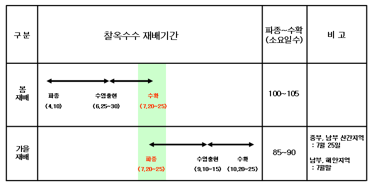 옥수수 가을재배인 경우는 늦서리의 피해가 없도록 10월 중순 이전에 수확할 수 있어야 하기 때문에 7월 상순 또는 중순경이 적당한 옥수수 파종시기입니다. 하지만 이때는 장마철에 과습하여 병들지 않게 배수관리를 잘해야 합니다.