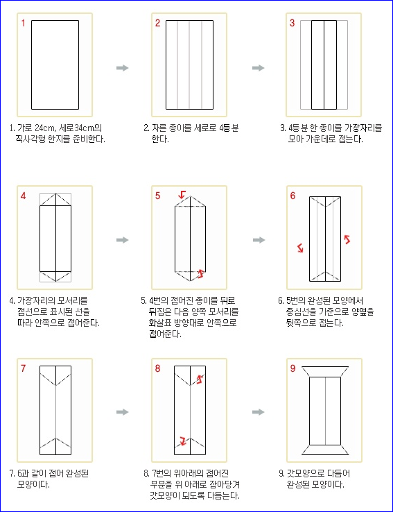 ■ 먼저 깨끗한 창호지(窓戶紙)나 한지(韓紙) 등 백지를 1번과 같이 가로 24cm, 세로 34cm 크기로 준비합니다.