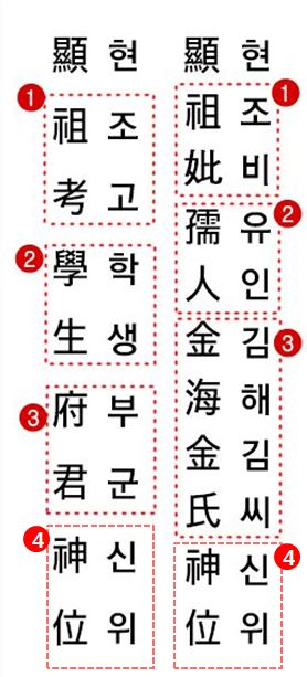 ※ 고위(아버지 등 남자 조상)는 좌측에, 비위(어머니 등 남자 조상의 아내)는 우측에 씁니다. ※ 한 분만 돌아가신 경우에는 중앙에 씁니다.