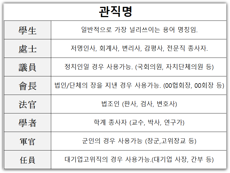 ※ 하지만 이는 조선시대 기준이라서 현대에는 고인이 공무원을 지냈다면 이사관, 부이사관, 서기관 등의 직위를 쓰면 됩니다.