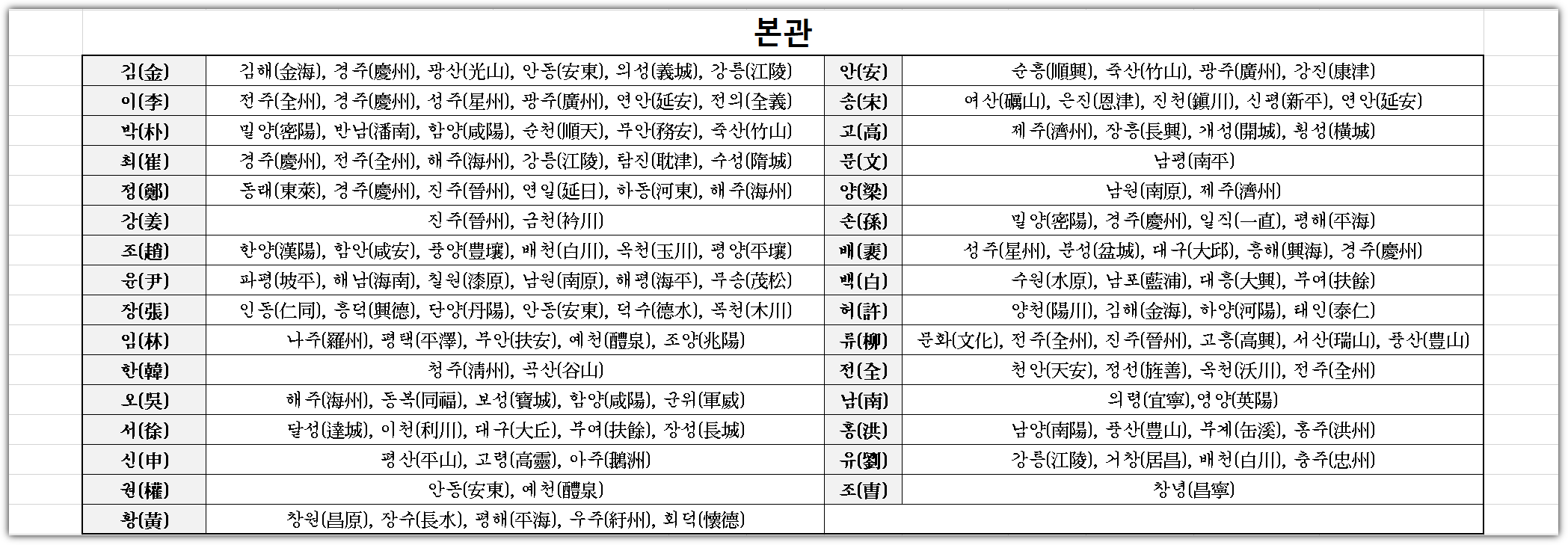 ● 여자 조상 : 본관과 성씨까지만 씁니다. 성은 아는데 본관은 잘 모를 수 있으니 정보 검색이 필요합니다.