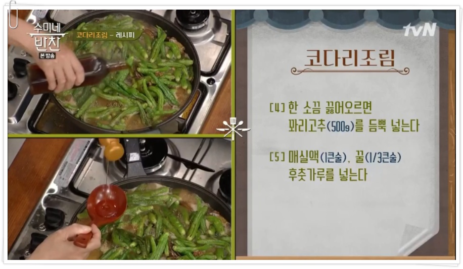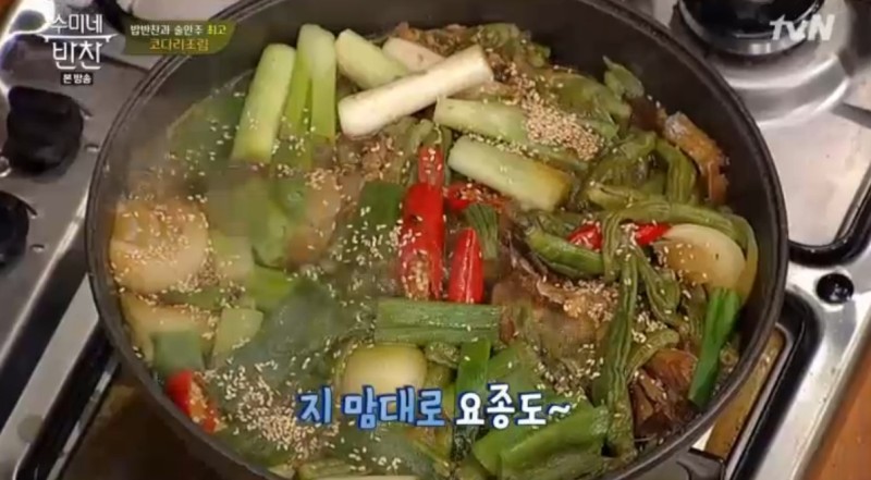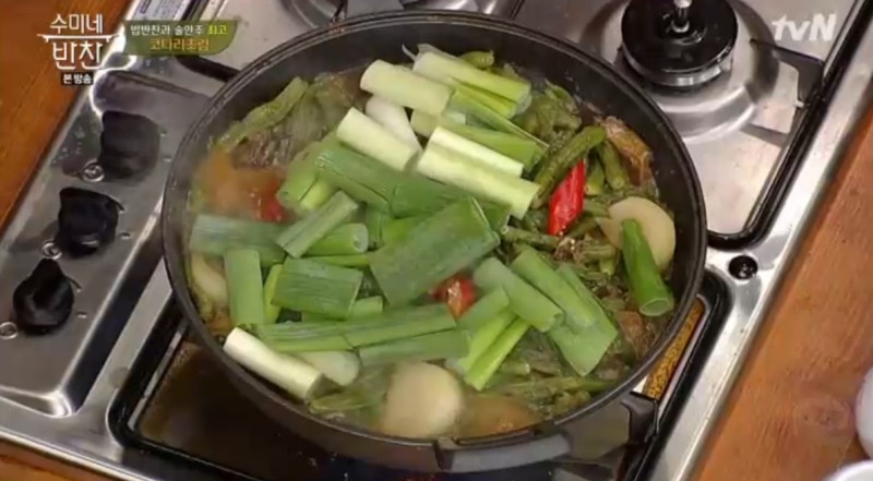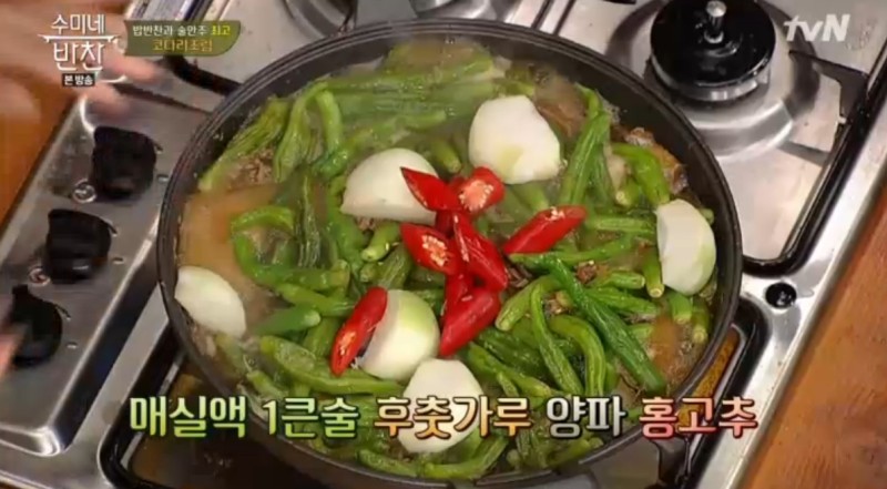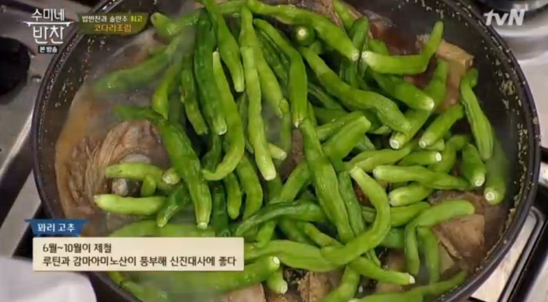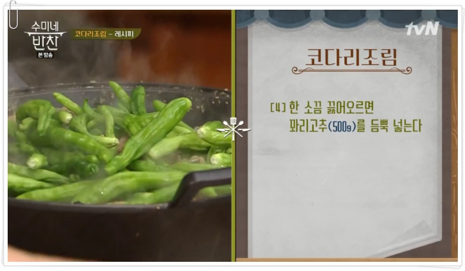 6. 한소끔 끓어오르면 꽈리고추를 500g 정도 듬뿍 넣습니다. 꽈리고추의 캡사이신 성분은 생선과 육류의 비린내를 잡아주는 역할을 한다네요.