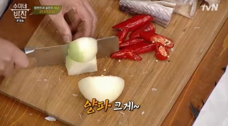 3. 양파는 큼직하게 3등분하고 홍고추 2개도 크게 어슷하게 썰어주세요.