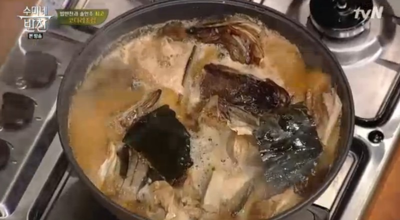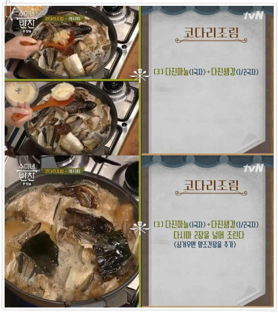 5. 코다리조림 황금레시피 이제 양념장을 만들 차례입니다. 다진마늘 1국자, 다진생강 1/2국자, 다시마 2장을 넣어 조립니다. 맛을 보시고 싱거우면 양조간장을 추가해 주시면 돼요.