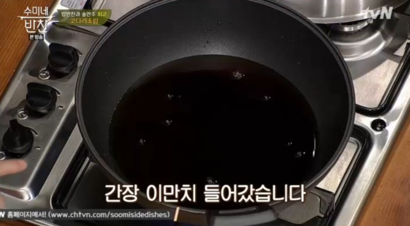 1. 코다리조림 황금레시피 가장 먼저 할 일은 팬에 물 800ml, 양조간장 2국자를 넣어 끓이는 것입니다.