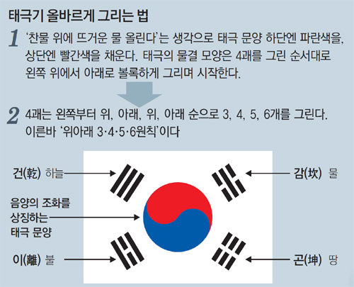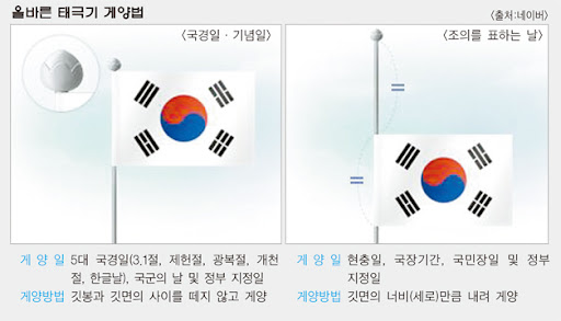 ※ 아파트 등 고층건물에서는 강풍 등으로 난간 등에 단 태극기가 떨어져 사고로 이어지지 않도록 주의