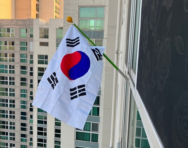 태극기를 게양하는 공식적인 시간은 오전 7시부터 오후 6시까지이며 이는 일출~일몰시간입니다. 밖에서 봤을 때 대문 또는 각 세대의 난간 중앙이나 왼쪽에 설치된 깃봉에 위에서부터 매달면 되는데요, 깃봉과 깃면의 사이를 떼지 말고, 매는 과정에서 태극기가 땅에 닿지 않도록 해야 합니다.