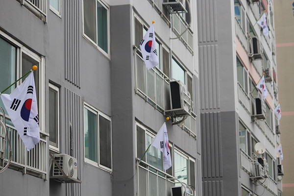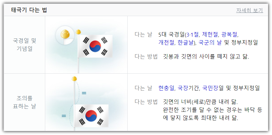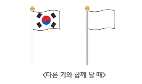 ※ 아파트 등 고층건물에서는 강풍 등으로 난간 등에 단 태극기가 떨어져 사고로 이어지지 않도록 주의