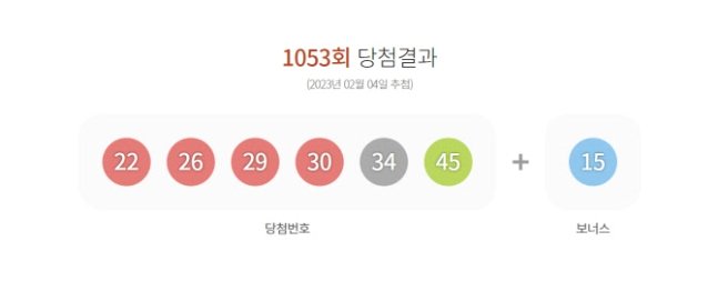 4일 추첨한 1053회 로또 당첨 번호는 '22, 26, 29, 30, 34, 45'가 1등 당첨 번호입니다. 2등 보너스 번호는 '15'입니다.