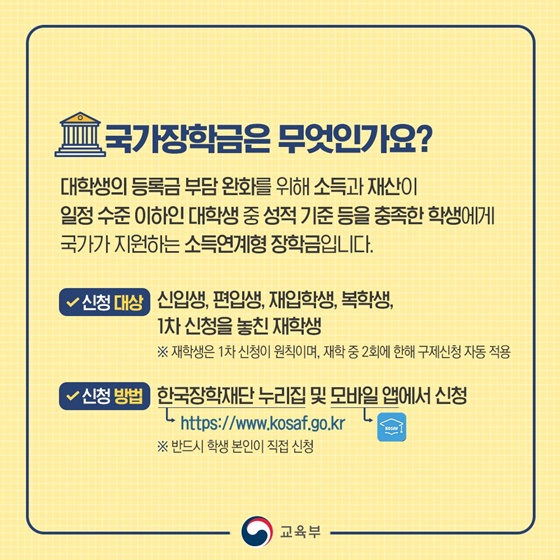 국가장학금은 대학생의 등록금 부담 완화를 위해 소득과 재산이 일정 수준 이하인 대학생 중 성적 기준 등을 충족한 학생에게 국가가 지원하는 소득연계형 장학금 제도입니다. 신청 대상은 신입생, 편입생, 재입학생, 복학생과 1차 신청을 놓친 재학생인데요, 이 중 재학생은 1차 신청이 원칙이며, 재학 중 2회에 한해 구제신청이 자동으로 적용됩니다. 그리고 반드시 학생 본인이 직접 신청해야 합니다.