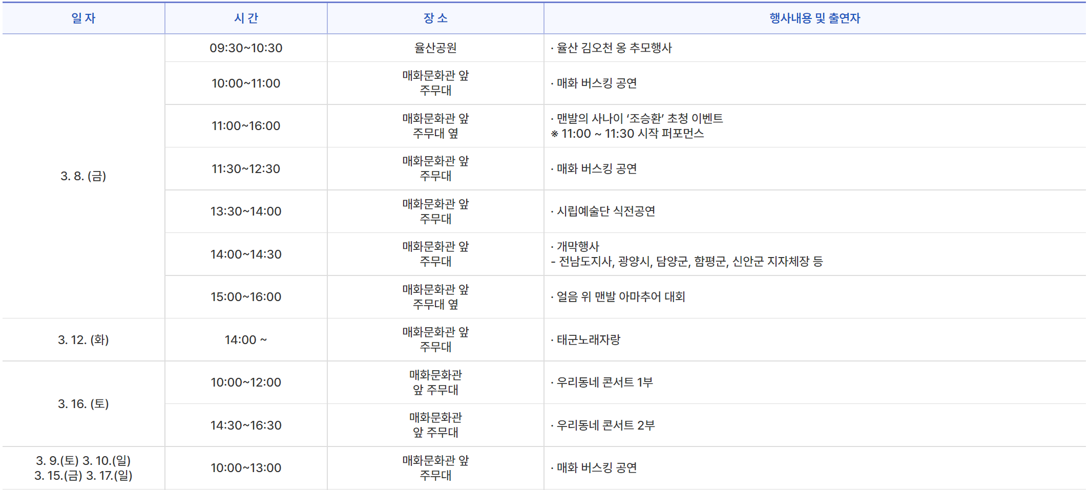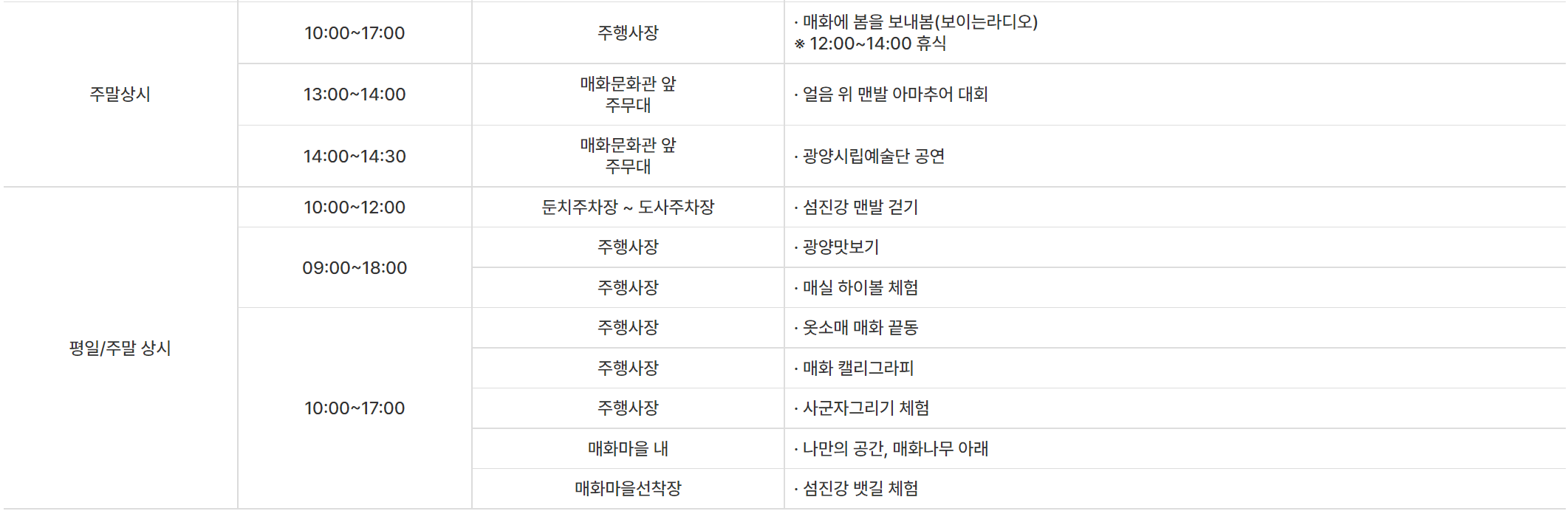 아울러 매화 꽃 흩날리는 매화 팜파티 등을 선사하는 1박2일 프로그램, 매실 하이볼 체험, 나만의 공간 매화나무 아래, 섬진강 맨발(얼음길)걷기 등 광양매화축제에서만 즐길 수 있는 킬러콘텐츠를 대거 도입합니다.