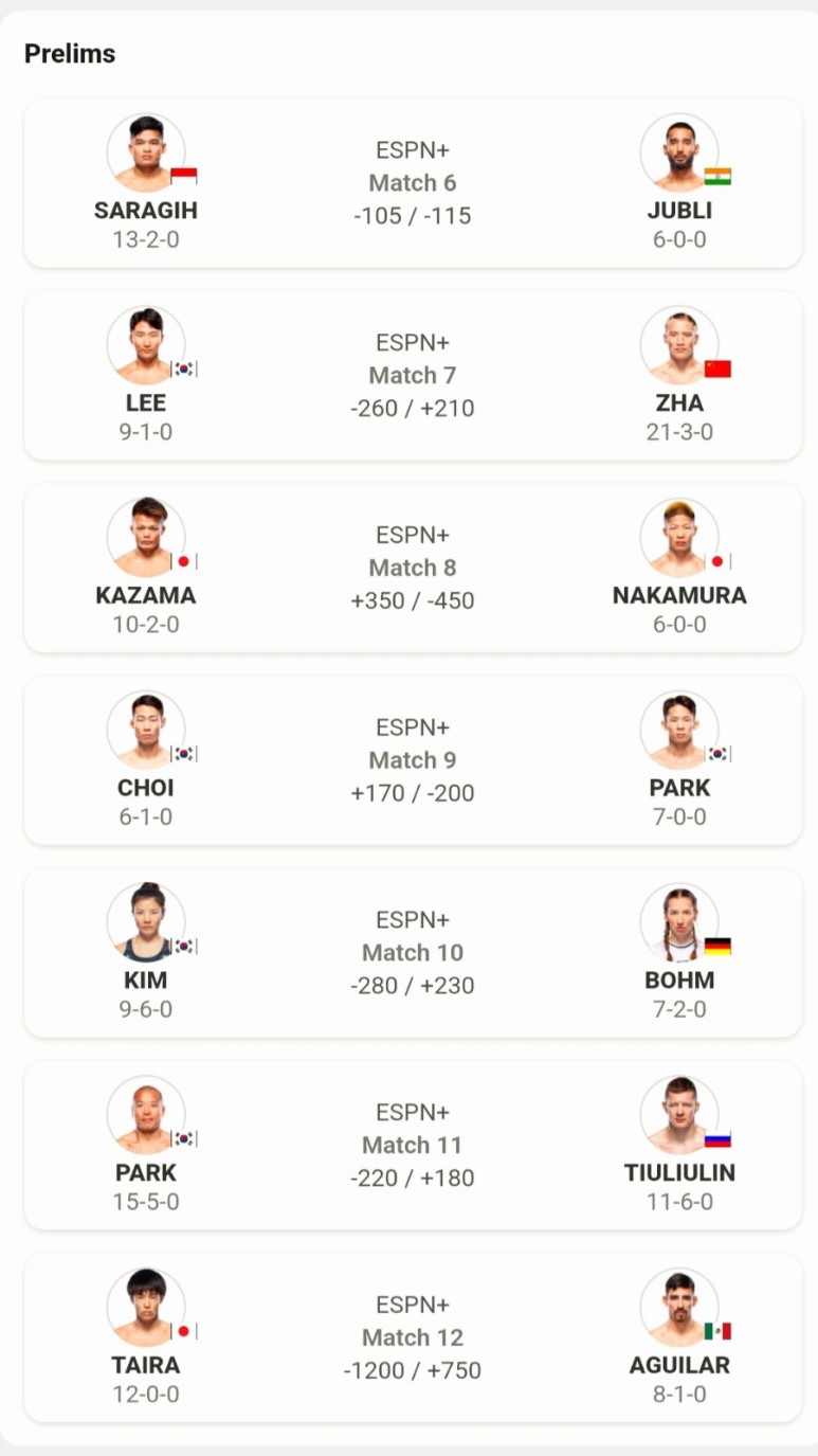 결과적으로 이번 UFC 경기에는 아시아 선수가 한국선수 7명, 일본 선수 4명, 중국, 인도네시아, 인도 선수 각 1명 등입니다.