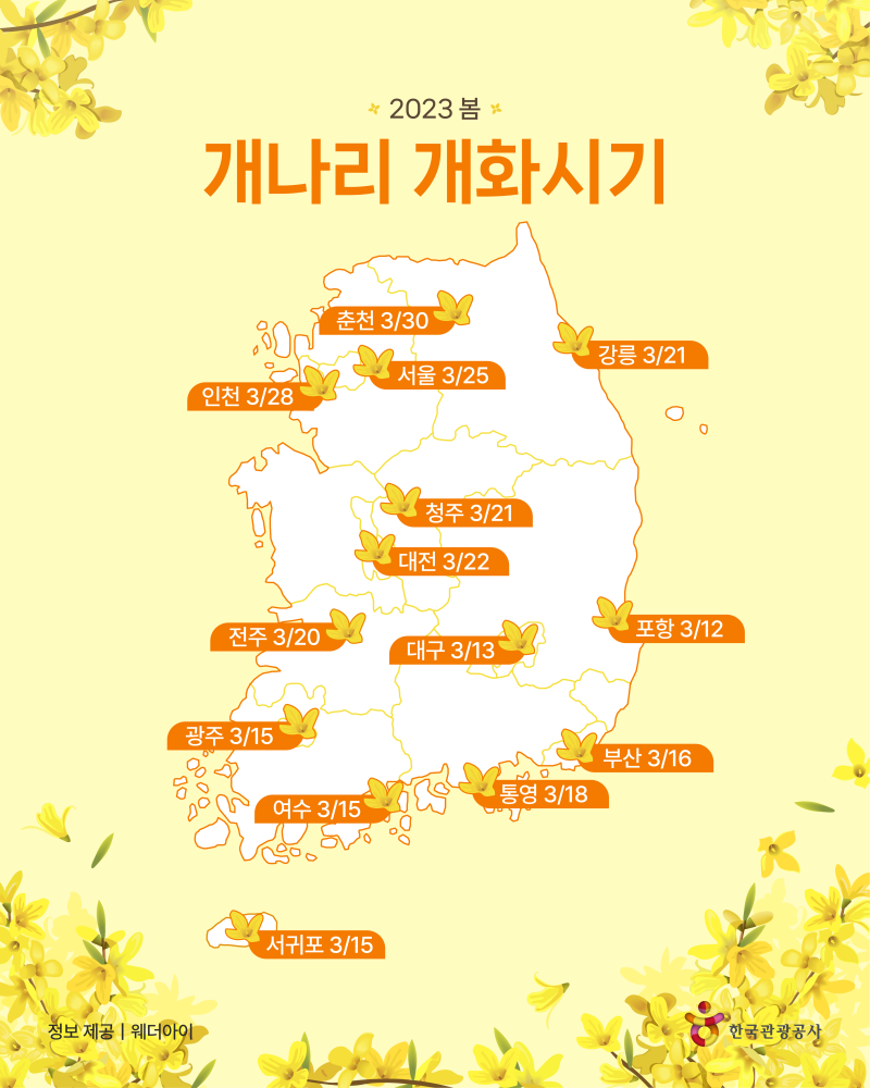 올해 개나리 개화시기는 가장 빠르게 포항과 대구에서 만날 수 있습니다. 서귀포와 여수, 통영과 부산을 비롯한 남부 지역에서는 3월 12일에서 20일 사이에 개나리를 만나 볼 수 있을 텐데요, 서울에서는 3월 25일경 봉우리를 틘 개나리를 볼 수 있을 것 같습니다.