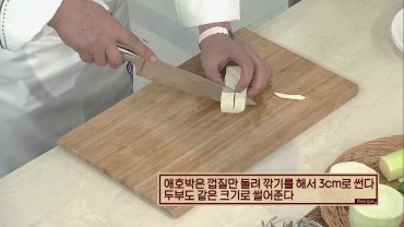 11. 냄비에 육수를 넣고 끓이다가 애호박을 넣어 주세요.