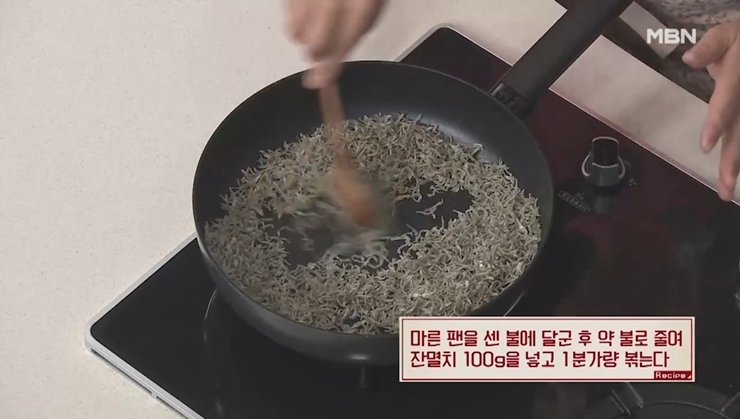 1. 먼저 센 불로 달군 마른 팬을 약 불로 줄인 뒤 잔멸치 100g을 넣고 1분가량 볶아 주세요.