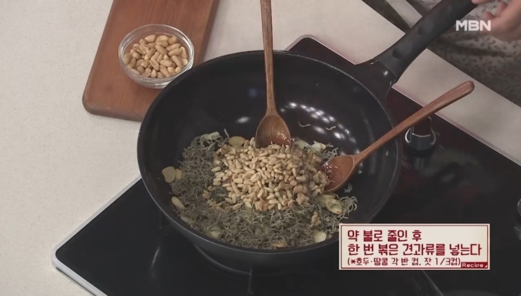 이후 약 불로 줄여 한 번 볶은 견과류를 넣어 주는데요, 이보은 멸치볶음 황금레시피에서는 견과류로 호두·땅콩 각 반 컵, 잣 1/3컵을 넣었어요.