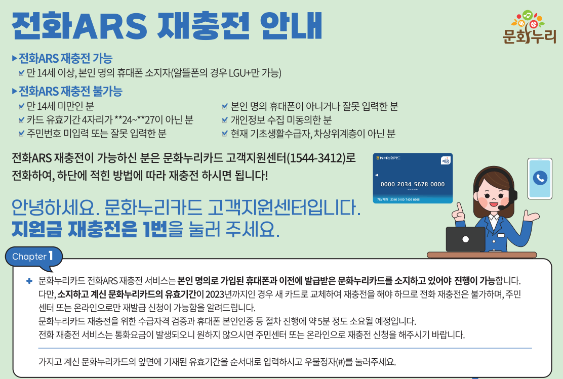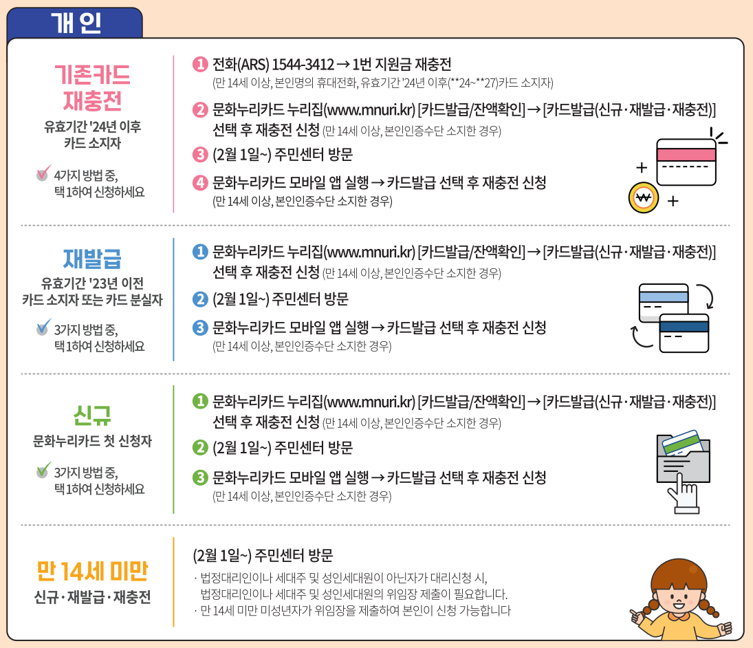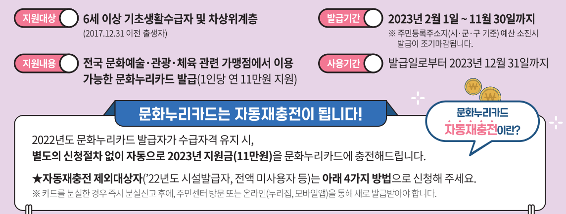 - 2023.2.1(수) 전국 주민센터, 문화누리카드 누리집, 모바일 앱, 전화(ARS) 재충전 발급 개시