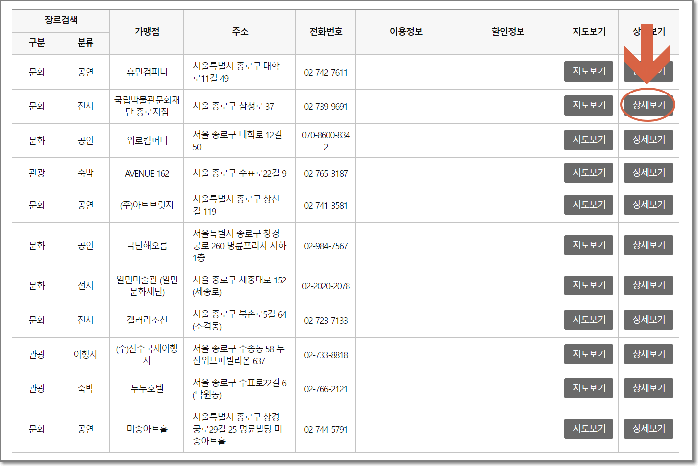 오프라인의 경우 아무래도 본인이 살고 계시는 지역을 기준으로 많이 검색을 하실것 같은데요, 예를 들어 서울시 종로구로 검색을 하면 다음과 같은 문화누리카드 사용처들이 있다는 것을 알 수 있습니다.