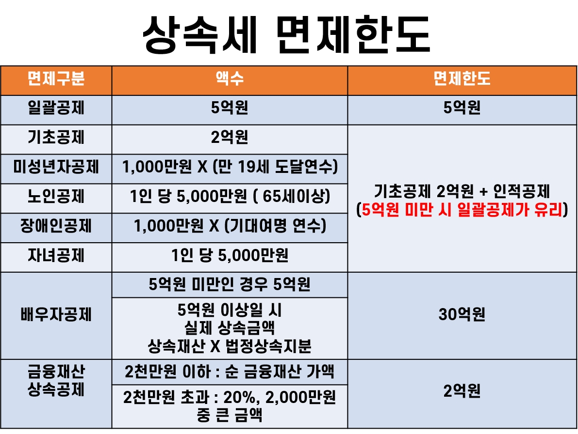 상속세 면제 한도액은 상속인 또는 수유자가 기초공제 및 배우자공제 이외의 기타 인적 공제의 합계액과 일괄공제(5억 원) 중 큰 금액으로 공제할 수 있는데요, 상속세 과세표준 신고가 없는 경우에는 일괄공제를 적용합니다.