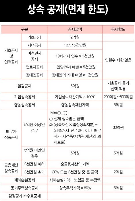 즉, 부모가 사망한 경우나 배우자가 없는 경우 일괄공제에 의하여 5억 원, 배우자가 있는 경우 10억 원까지가 상속세 면제 한도액으로 상속세가 면제되며 추가적으로 장례비용은 증빙이 없어도 500만 원까지 공제가 되기 때문에 부모가 사망한 경우 최소한 5억 5백만 원까지는 상속세가 면제된다고 볼 수 있습니다.